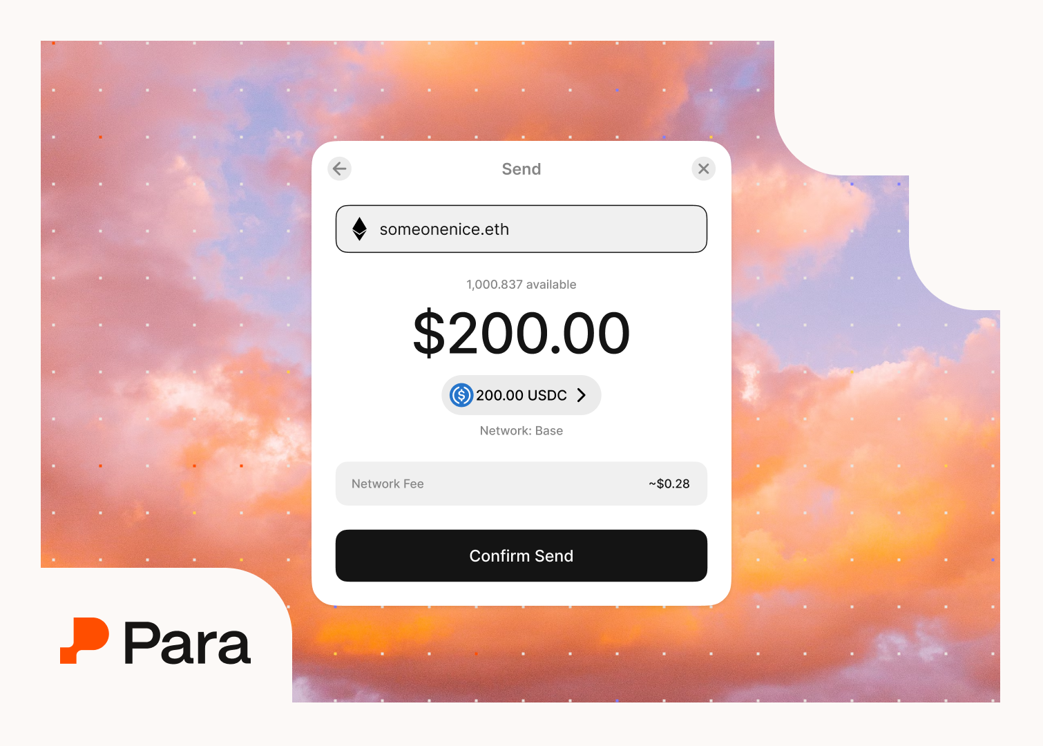 Sending tokens is now easier than ever. Para 2.0 includes native Send functionality that lets users transfer funds from their embedded wallet with minimal developer effort. In the Para modal or widget, users can initiate a transfer (e.g. “Send”) and the SDK handles the heavy lifting of transaction creation, signing, and broadcasting.