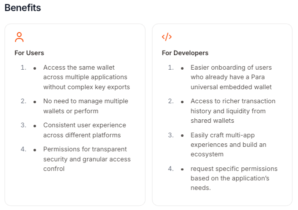 Cross-app wallet portability. Your users' wallets work in every Para-integrated application. They onboard once and transact everywhere with no repeated signups, no fragmented identity.