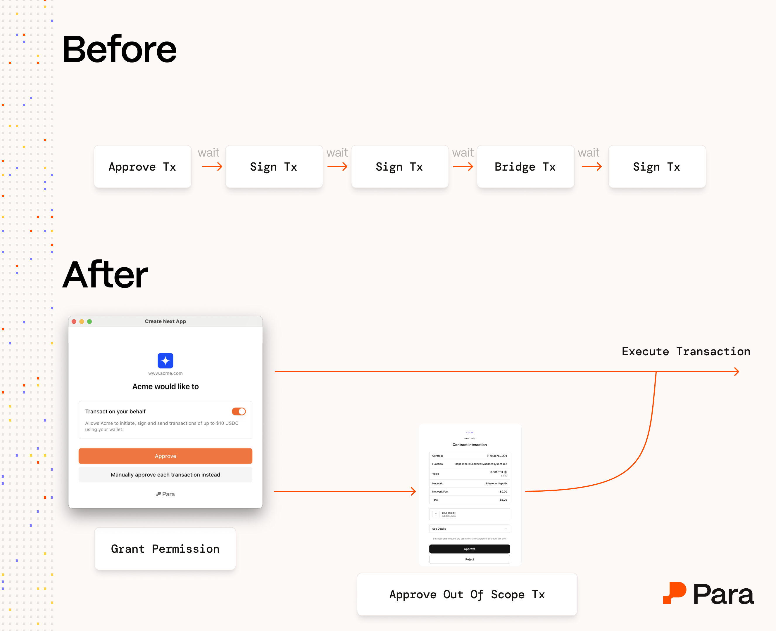 Today, we’re excited to announce the launch of Para Transaction Permissions. Para Permissions bridge this gap by enabling granular wallet access to applications via programmable scopes and conditions, in partnership with Aave and Eco.