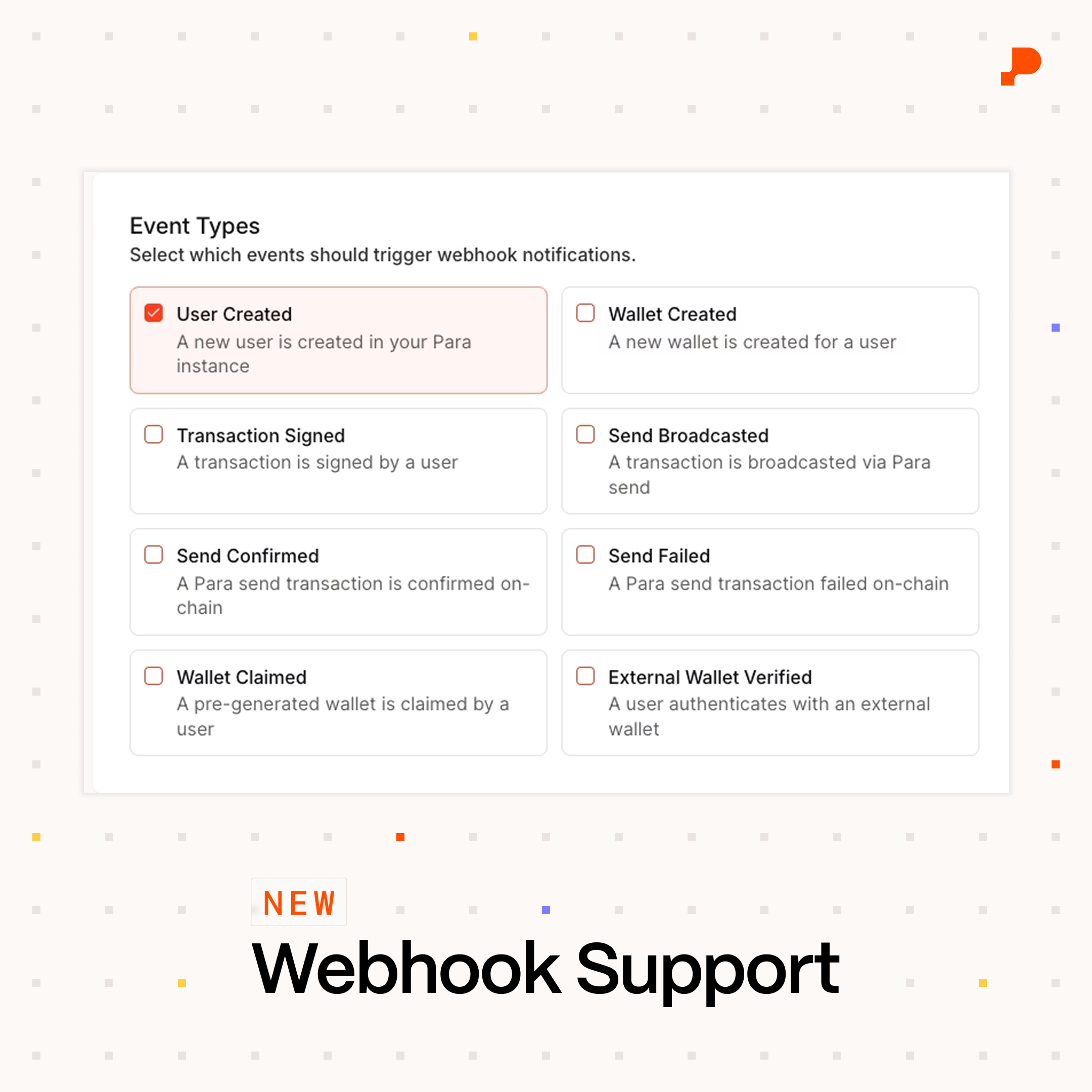 When something meaningful happens in your Para integration like a user signs up, a wallet is created, a transaction is signed a user signs up, a wallet is created, a transaction is signed, Para will instantly send an HTTP POST request to an endpoint you control. Your backend receives the event in real time and can act on it immediately: trigger a workflow, update your database, send a notification, or anything else your application needs.